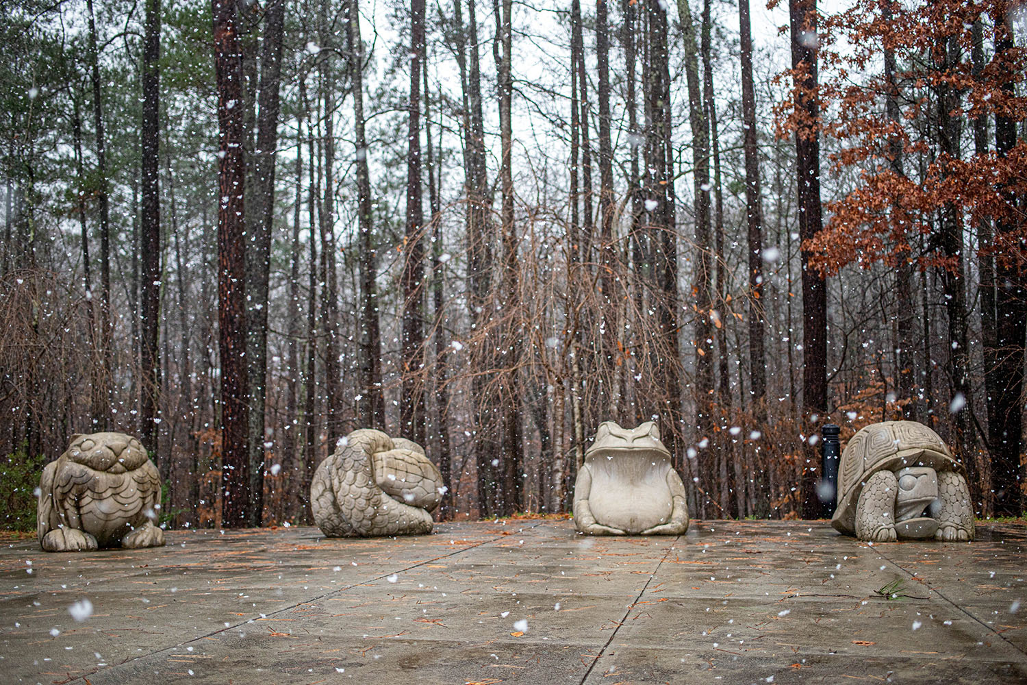 Officially titled “The Grand Intimate,” by artist Todd Frahm, these four carved limestone statues—depicting a rabbit, tortoise, toad, and snake—are a favorite among library visitors. These animals were chosen in particular because of their frequent reference in childrens’ stories and fables, making them a fitting addition to the library grounds. Installed in 2015 after the library’s reopening, you can now visit these statues near the pollinator garden behind the library terrace. This artwork was funded through the Town of Chapel Hill’s percent for art program.