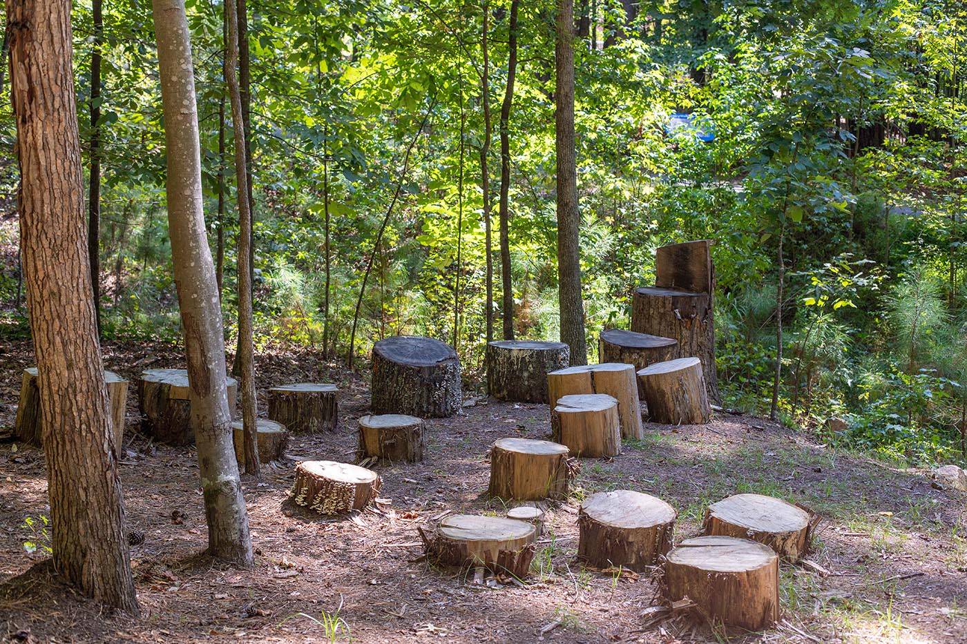 This nature play area located right off the paved trail invites kids of all ages to climb, jump, and explore. It features logs and stumps of varying heights, a wooden bridge, and a rope hammock.