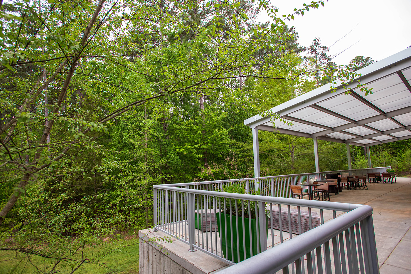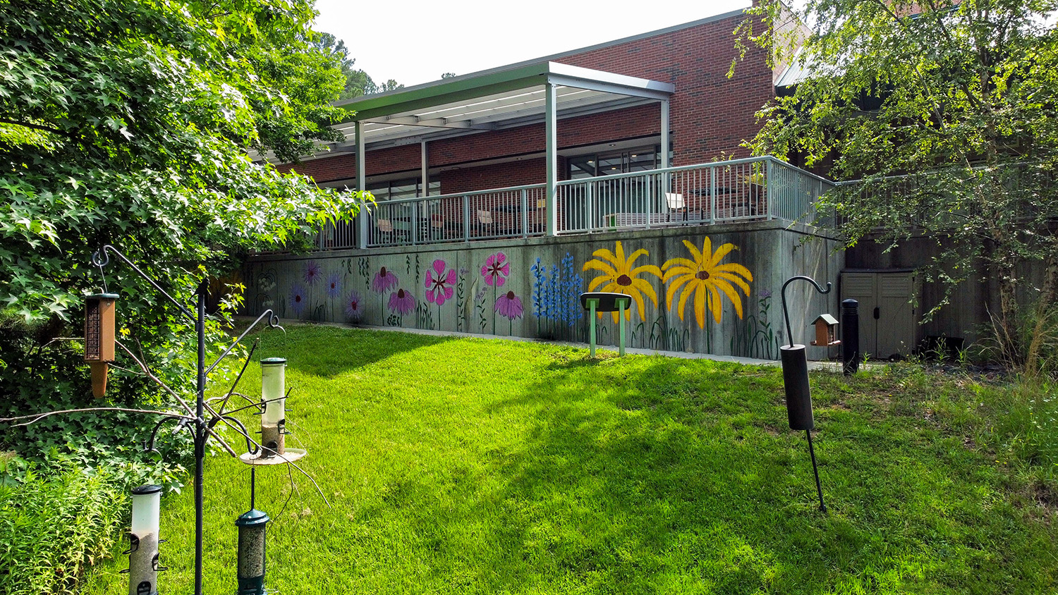The covered terrace behind the library is a great spot to study, work, eat lunch, or just relax. It’s furnished with tables and stools, and has access to the library’s free Wi-Fi. You can access the terrace through the Kids Room, Meeting Rooms A and B, or by following the path along the north side of the building. The awning and fixtures were added in 2018 with support from the Chapel Hill Public Library Foundation.